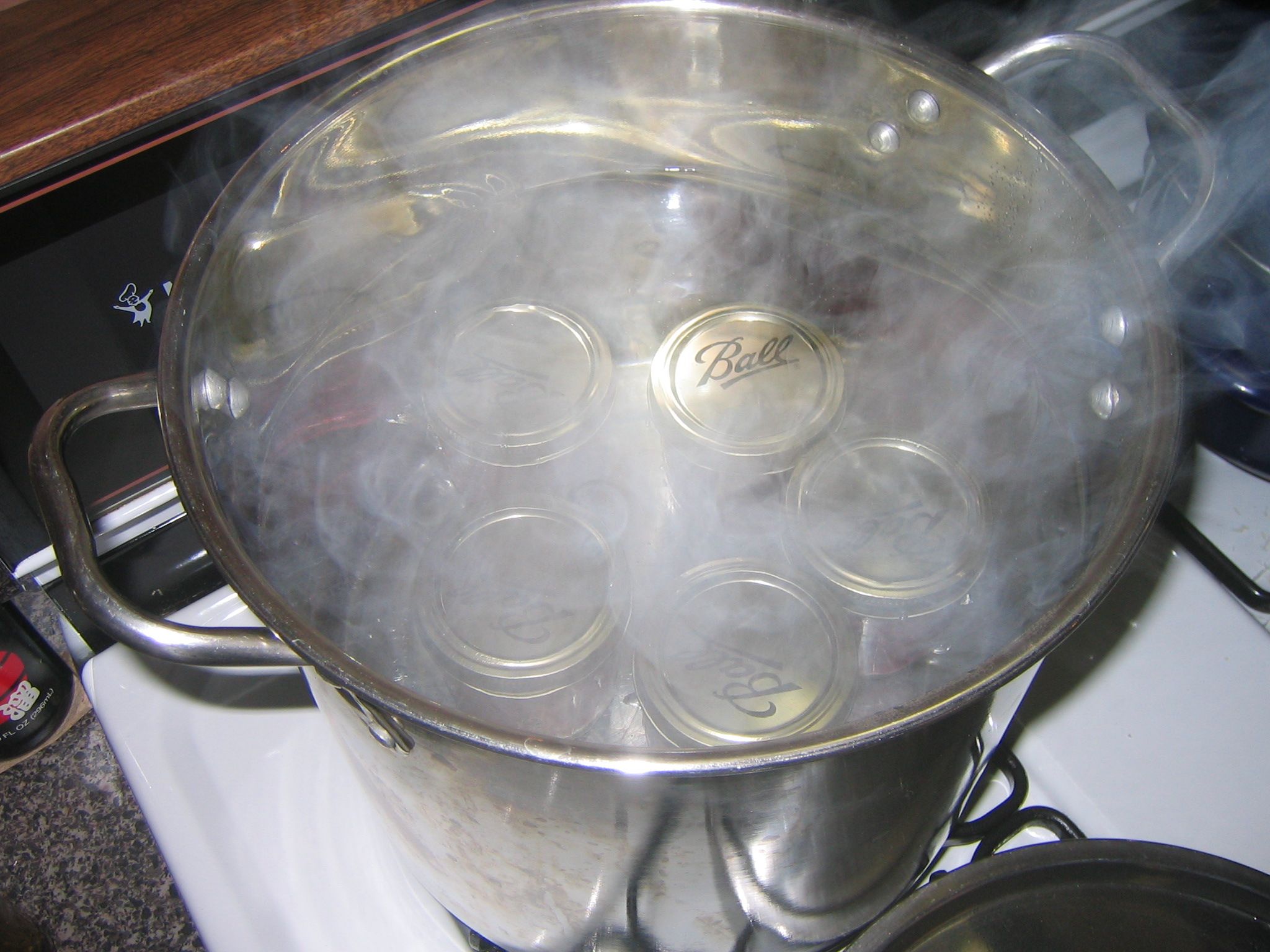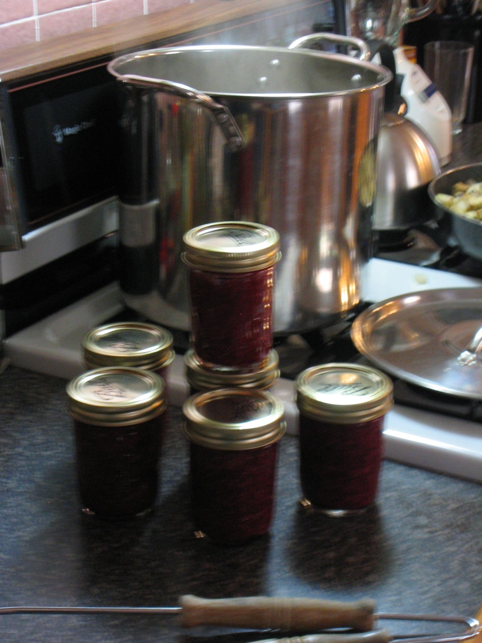 jam, from berries we picked yesterday. We used honey instead of sugar, and less than is usual, so the jam is tart, but also tasty. It was shockingly easy, especially in comparison to our adventures in separating curds and whey. I'm not quite sure what to do with it all; 6 jars of jam is a lot.